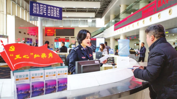 車管所內由黨員帶頭服務,將原先分散在辦證大廳、檢測線、號牌製作點等處的窗口整合成一條“紅色流水線”。車管所辦證大廳谘詢服務台黨員民警翟雲每天麵對數以千計辦事群眾,她摸索提煉出“五心”工作法,用熱心、誠心、細心、公心、恒心,讓每一位群眾都能享受到高品質的車駕管服務。